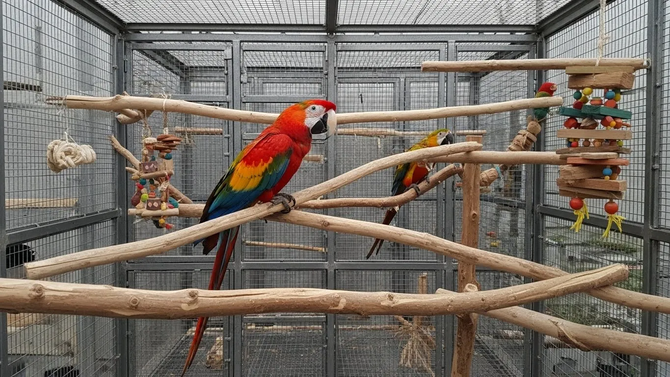 A very large, sturdy cage with ample space, natural perches, and chew-resistant toys.